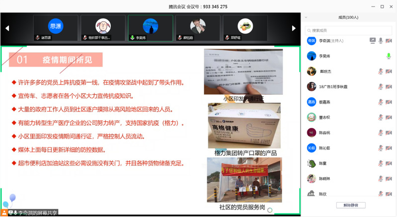 18级酒店管理1班李昊炜分享了防疫志愿工作背后的故事。他讲到,自己虽然没有医学专业知识,但通过为进出街道及社区居民测量记录体温、发放社区居民登记表、登记外来人员相关信息等为疫情防控贡献出自己的一份力量。经过此次疫情,他深感作为新时代大学生更应艰苦奋斗、提升自我,为党和国家事业发展积蓄力量。