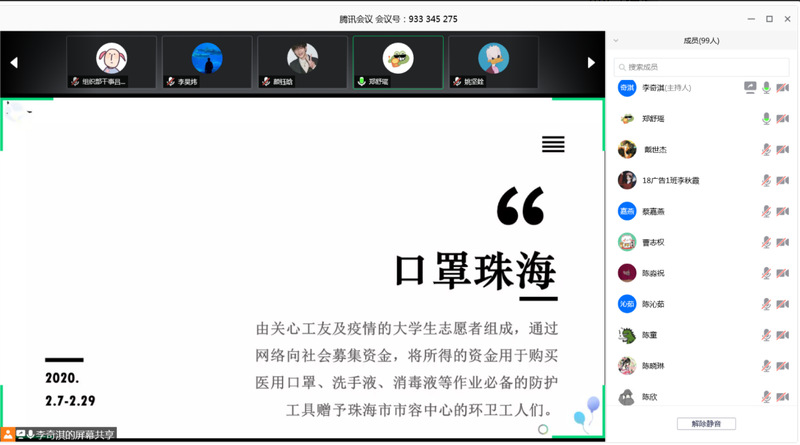 18级广告学1班郑舒瑶通过云端视频生动展示了她所参与的口罩珠海志愿活动。她讲到,为解决返工潮来临时广大环卫工人的口罩紧缺问题,她与其他志愿者一道以募捐等方式捐赠了5000只防护口罩、2000支消毒液,并利用所学专业知识负责完成了环卫防疫手册制作、防疫知识讲解等。她认为,作为新时代大学生应牢记总书记寄语精神,不畏艰险、勇担责任,积极弘扬奉献互助的志愿精神。