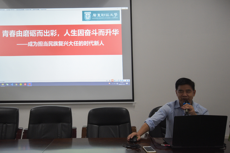 再谈到“要在新长征路上奋勇搏击”、“努力做品学兼优的广财好学生”,贺敏伟院长总结了目前的中美关系,并提出了青年人应该“怎么看”、“未来怎么办”的思考题。随后,他结合国际形势,为同学们分析了专业发展方向,希望同学们练就真本领,把握新机遇,知行合一实现人生增值。
