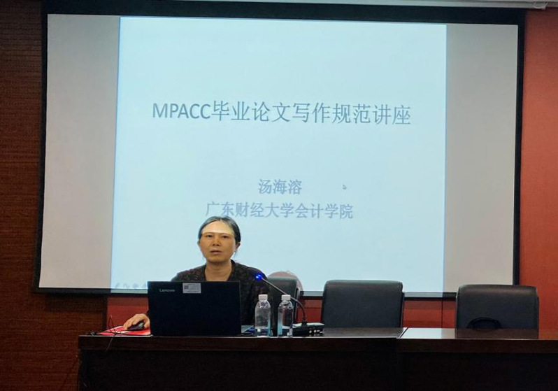 11月22日下午,会计学院硕士生导师汤海溶副教授,以《MPAcc毕业论文写作规范》为题,从结构规范和格式规范;问题论文与优秀论文的的对比;论文写作的三个过程等三个部分,向毕业班专业硕士研究生详细阐述了写作的基本规范和要求。最后汤老师引用了王国维的诗句生动展示了论文写作的三阶段:第一阶段“昨夜西风凋碧树。独上高楼,望尽天涯路。”要耐得住寂寞,不断求索;第二阶段“衣带渐宽终不悔,为伊消得人憔悴。”执着坚韧,不忘初心;第三阶段“众里寻他千百度,那人却在灯火阑珊处。”终有所悟,豁然开朗。