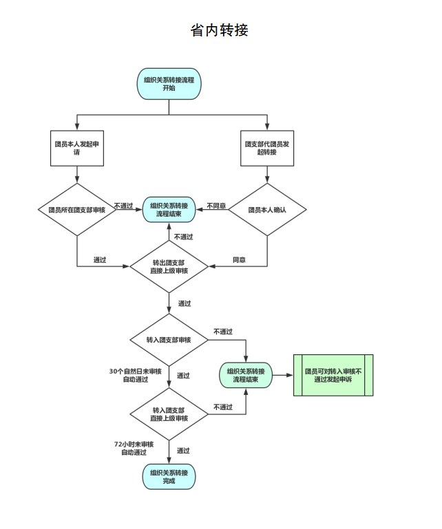(三)省内转接的团员,转入团支部必须在30个自然日内(含30日)完成组织关系转接的审核工作,超时“智慧团建”系统将默认为转入团支部同意接收并自动审核通过;转入团支部的上级团委必须在72个小时内完成接收审核,超时“智慧团建”系统将默认为上级团委同意接收该团员并自动审核通过;团员教育、管理和监督责任由转入团支部及其上级团委承担。跨省跨系统转接的团员,团支部应在10个自然日内完成省外团员的团员报到审核工作。
