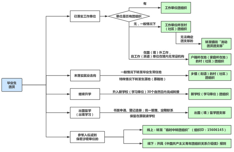 (一)6月15日前已落实工作单位的毕业生团员,应将团组织关系转接到工作单位团组织;工作单位尚未建立团组织的,应转接到工作单位所在地村(社区)团组织;特殊情况下确实无法转入村(社区)团支部的,可转接到工作单位所在乡镇(街道)设置的“流动团员团支部”。在国(境)外工作,工作(派遣)单位在境内无常设机构的,应转接到本人户籍所在地(家庭所在地)村(社区)团组织。