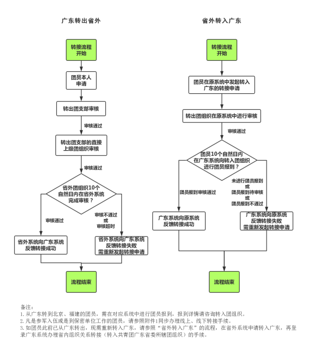 (三)从省外转入广东(共青团广东省委所辖团组织)的毕业生团员,应由其原使用的“智慧团建”系统发起组织关系转至广东的申请。转接申请经转出团组织审核通过,团员需在10个自然日内通过微信公众号“广东共青团”或“12355青年之声”向申请转入的广东团组织完成团员报到(含完成组织审核通过)。各级团组织应及时审核省外团员转入学校的团员报到申请,超过10个自然日未审核,将导致团员须在原系统重新发起组织关系转接申请。