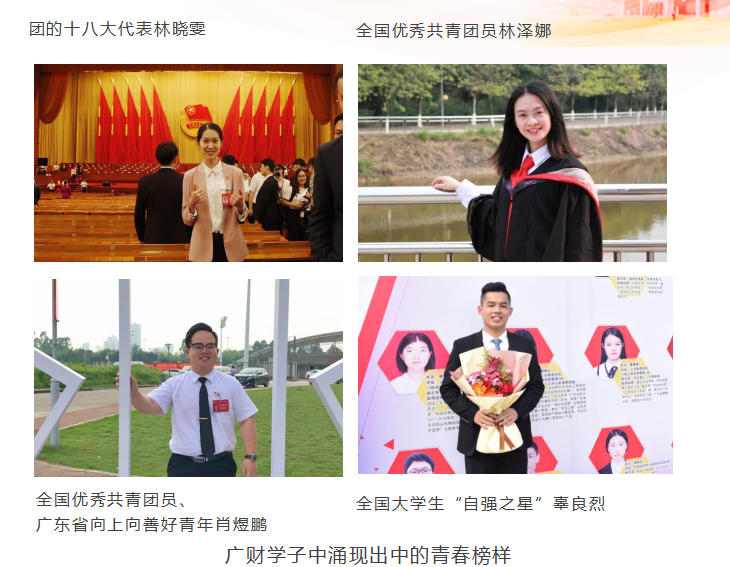 坚持立德树人、聚焦主责主业,着力提升团的引领力。常态化开展“青年大学习”活动,参学学生超60万人次,参学比在全省高校持续名列前茅。开展校院两级“青马”培训145场,覆盖学生3万余人次。深入开展“我的中国梦”主题教育实践活动,“与信仰对话”项目获全国重点报告会立项。网络思政工作提质增效,“广财青年”微信号影响力稳步提升。青年学生中涌现团的十八大代表、全国践行社会主义核心价值观先进个人、全国优秀共青团员、广东省向上向善好青年、广东“优秀战疫志愿服务典型”、广东省学联执行主席等一批青春榜样。