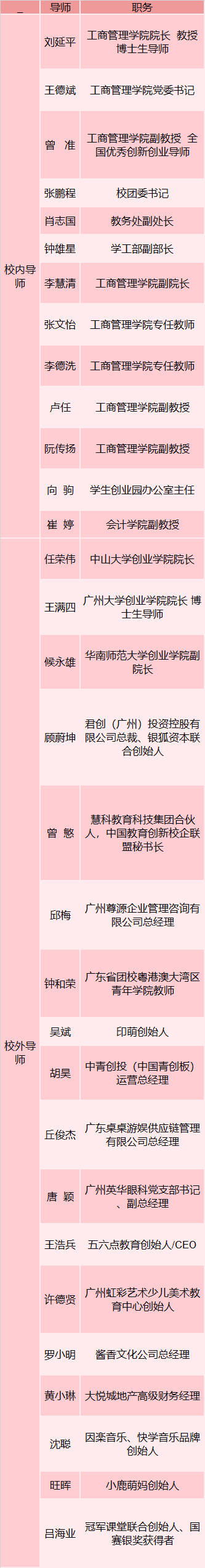 本次课程邀请了学校知名经济管理专家、高校创业类课程教学名师、广东省“挑战杯”和广东省“互联网+”创新创业大赛评委担任主讲教师,教学能力突出,创业竞赛指导经验丰富,教学形式生动。(具体师资简介详见附件2)