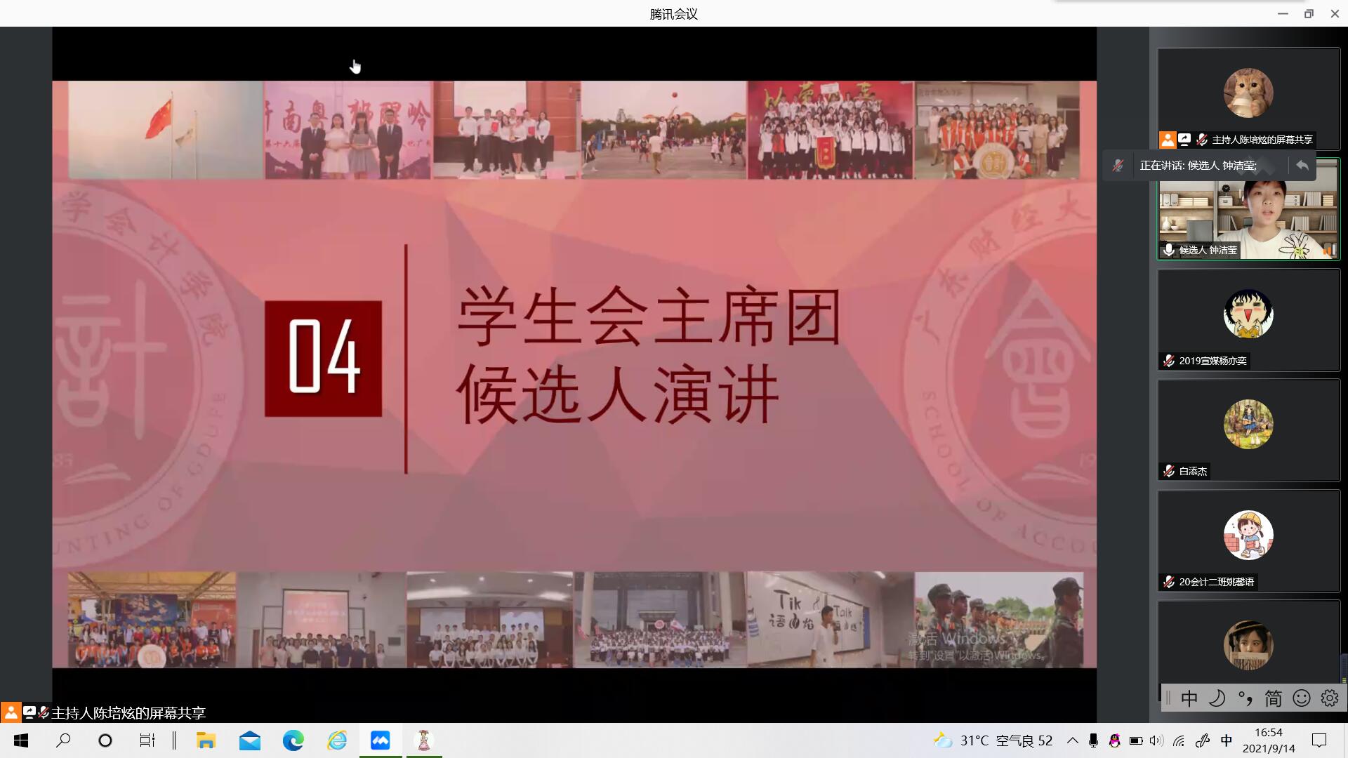 大会进行第四项:候选人演讲。四位候选人:谭菲、周江泉、林永茵、钟洁莹依次发表自己的候选演讲,从他们的演讲中可以感受到他们在本学年内对学院活动建设的热情付出和对竞选的志在必得。