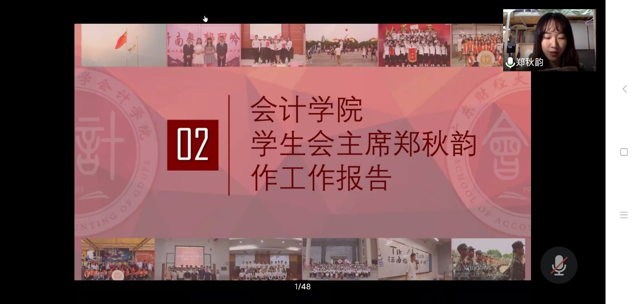 大会进行第二项:会计学院现任学生会主席郑秋韵作工作报告。报告全面总结了学院学生会工作,探索和规划了今后一年学生会的工作目标和任务。