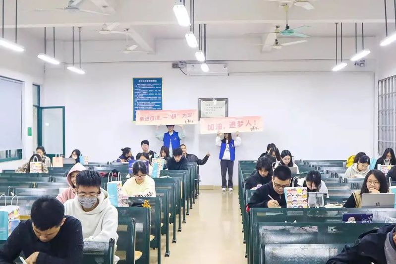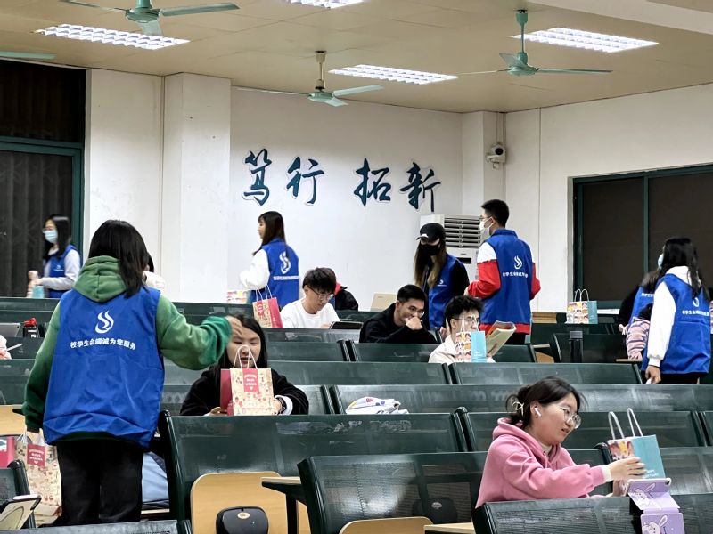 冬至当晚,m88校学生会工作人员带着寄托满满祝福的礼袋来到考研自习室,为他们送上学校的温暖。