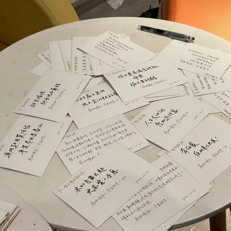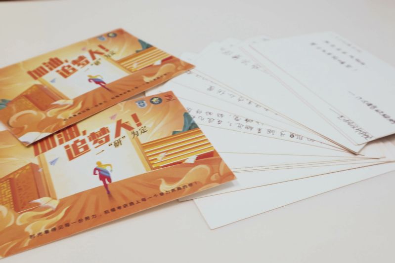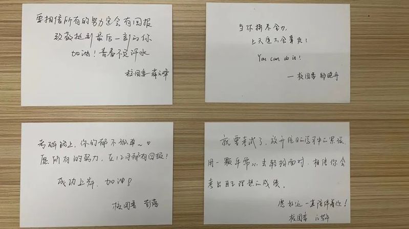 学校老师、考研上岸师兄师姐、各学院师弟师妹亲手在卡片上写下祝福,用真诚温暖的话语为考研同学加油鼓劲。