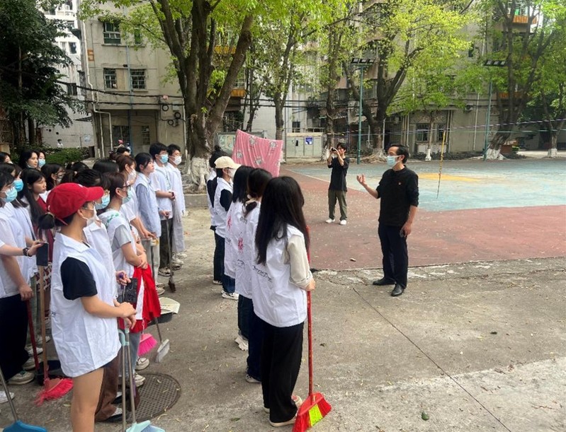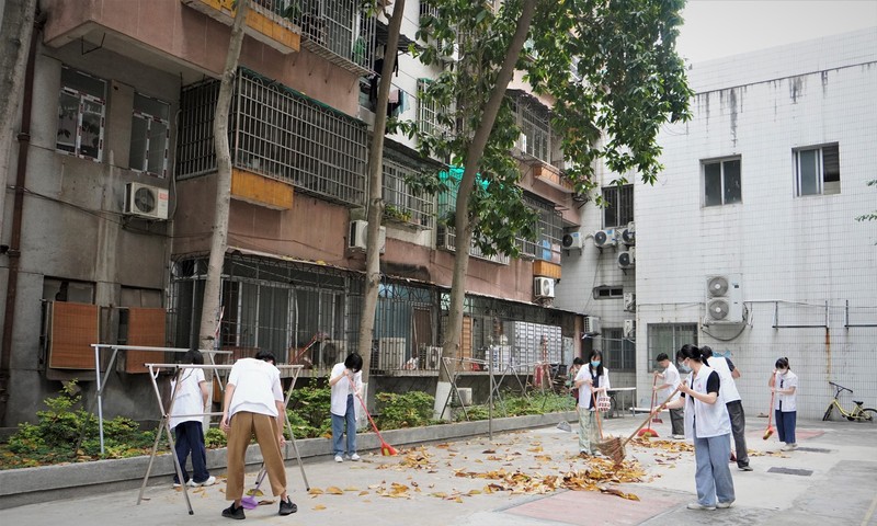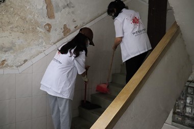 志愿者在打扫楼道