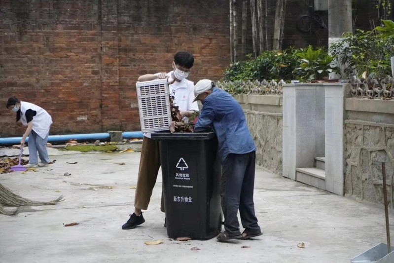 志愿者在清扫树叶