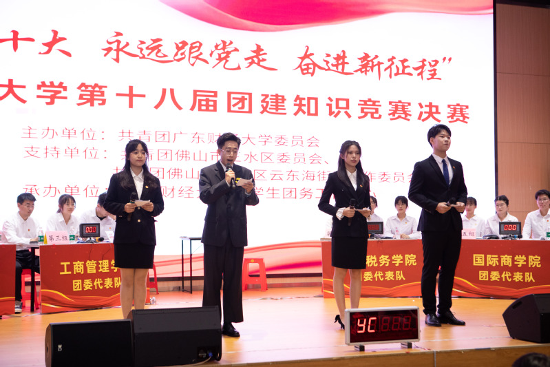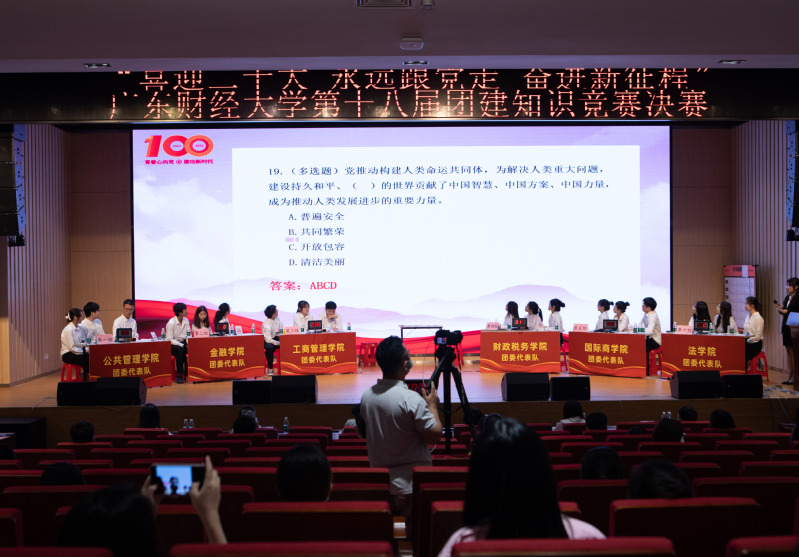为教育引导广大团员青年传承奋斗精神、建功新时代,展现青年学生蓬勃向上的精神,5月24日,“喜迎二十大、永远跟党走、奋进新征程”第十八届团建知识竞赛决赛在佛山校区同心楼报告厅隆重举行,本次比赛由校团委主办,共青团佛山市三水区委员会支持举办,校团委副书记张琦、三水团区委副书记徐绍星以及云东海街道党建工作办公室和街道团工委有关负责人出席了本次竞赛现场,共同见证经过多轮比赛脱颖而出的6个学院团委代表队伍同台竞技,争夺本次团建知识竞赛的奖项与荣誉。
