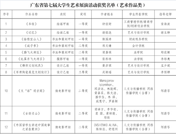 近日,广东省第七届大学生艺术展演活动获奖结果揭晓。m88获一等奖6项、二等奖6项、三等奖1项,学校荣获“优秀组织奖”。艺术表演类集体朗诵乙组(专业组)一等奖作品《时间的入口》(推荐单位:湾区影视产业学院,指导老师:郭丽莉)和艺术作品类绘画甲组一等奖作品《丰收》(推荐单位:工商管理学院/粤商学院/创新创业学院,指导老师:安海波)获推荐至教育部参加全国第七届大学生艺术展演活动。