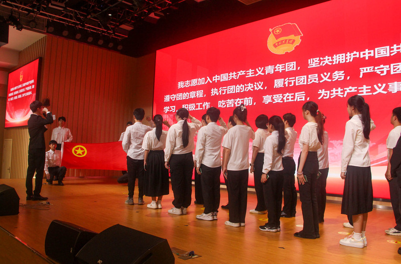 “我们将坚定理想信念、积极追求进步,坚守团结奋斗、敢于‘自找苦吃’,坚持砥砺前行、不懈追寻梦想,在强国建设、民族复兴伟业中勇当先锋队、突击队!”湾区影视产业学院2022级数字媒体艺术1班团支部郭梓晴代表全体新团员庄严承诺。