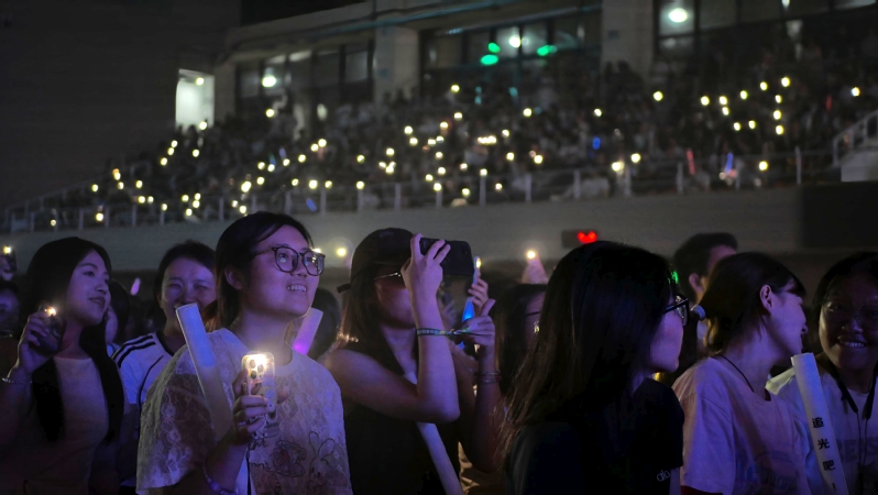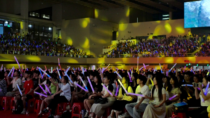 “我怕我没有机会,跟你说一声再见”惊喜响起,在《再见》旋律中,全场毕业生挥舞手机闪光灯齐声高唱,星光与歌声汇聚成璀璨星河,照亮了整个体育馆。嘹亮的歌声中,有对过往的眷恋,更有对未来的笃定与期待。