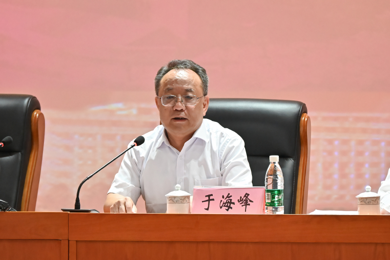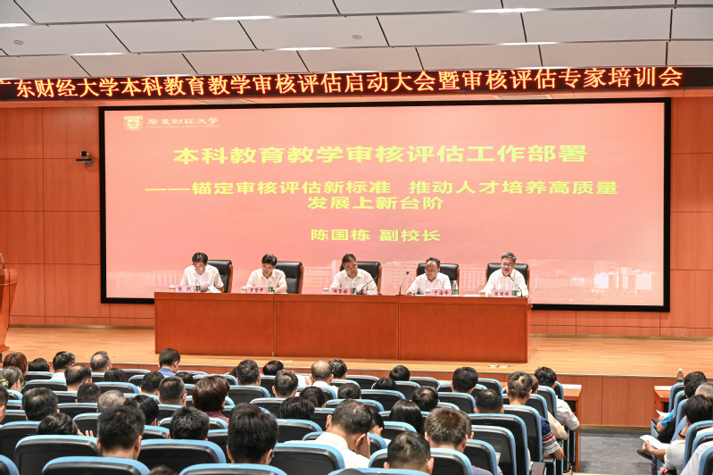 接下来,校长于海峰作审核评估工作动员讲话。他结合审核评估准备阶段、线上评估和入校评估三个重要时间节点,从审核评估过程把握的角度指出:在准备阶段要充分调动全员的积极性和主动性,要全体动员、全员参与、全面发力;在线上评估阶段,各职能部门、教学单位和所有师生要建立起全员的快速反应机制,对专家提出的评估任务及时高效反馈;在入校评估阶段,全校师生要呈现出良好的精神风貌,饱满的热情,以“主人翁”的姿态迎接审核评估专家组。并对全校审核评估工作提出三点要求:第一,要高度重视,深刻把握审核评估的精髓要义。新一轮本科教育教学审核评估不仅是对学校教育教学质量的一次全面检验,也是推动学校内涵式高质量发展的重要机遇。全校上下要高度重视这一评估工作,将其视为推动学校教育教学改革的有力抓手,通过启动大会、专家培训多角度全方位把握新一轮审核评估的精髓要义。第二,要全力以赴,扎实落实审核评估的工作任务。评估办公室要牵头抓总、压实责任,挂图作战;各专项工作组要主动作为,系统学习研判指标体系,抽调的工作人员要切实承担起工作责任;各职能部门、教学单位要做好各项数据材料的梳理报送、资源保障、校园环境美化、教学文档准备等工作。第三,要对标对表,切实提升审核评估的工作效度。要坚持问题导向,严格按照评估方案的要求,对照审核重点强特色补短板,制定“问题清单”,发现、培育本单位的特色和优势。要勇于面对存在的问题和不足,深入剖析和研究问题的根源,制定具体、切实可行的整改措施,切实为大湾区一流财经大学的高质量发展出谋划策。